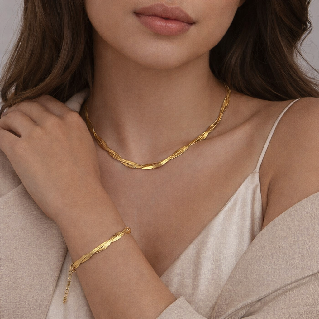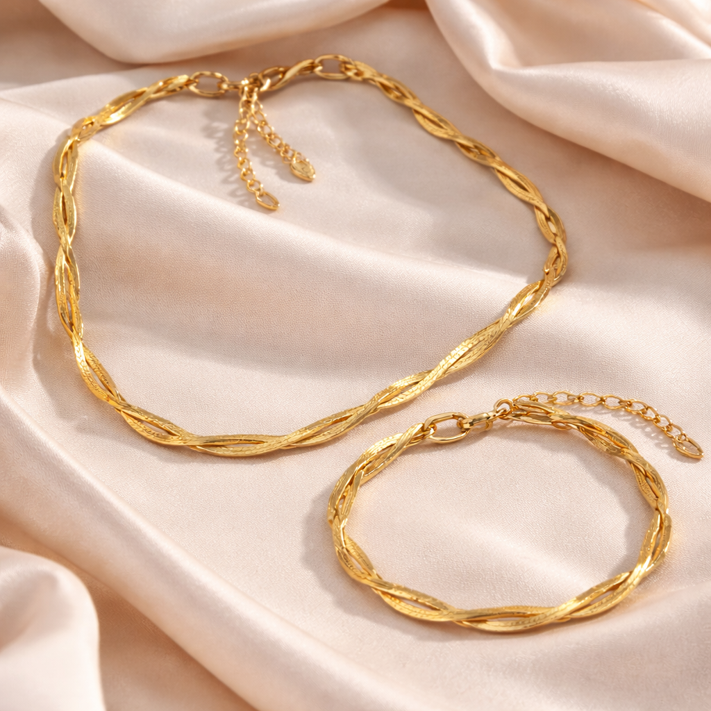 Un conjunto que transforma cualquier look en segundos. Este collar y pulsera de acabado dorado combinan un diseño trenzado moderno con un brillo sofisticado que aporta presencia sin resultar recargado. Es esa pieza que eleva un outfit básico y encaja igual de bien en el día a día que en ocasiones especiales.